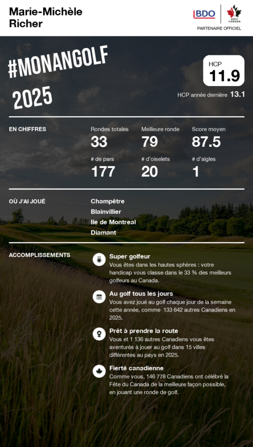 Les membres de Golf Canada peuvent désormais revivre leur saison de golf 2025 avec #MonAnGolf, un résumé annuel personnalisé de leurs parties, des jalons importants qu’ils ont franchis et de leurs réalisations, présenté par BDO.