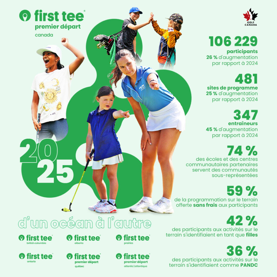 First Tee – Premier départ Canada a enregistré son plus grand nombre de participants en 2025, avec plus de 106 000 jeunes engagés dans des programmes à la grandeur du pays, marquant une augmentation de 25 % par rapport à l’année précédente. Depuis son lancement en 2021, First Tee – Premier départ Canada a initié au golf plus de 276 000 jeunes Canadiens et Canadiennes.